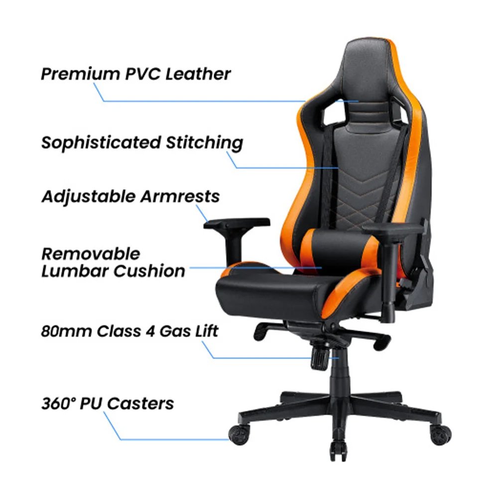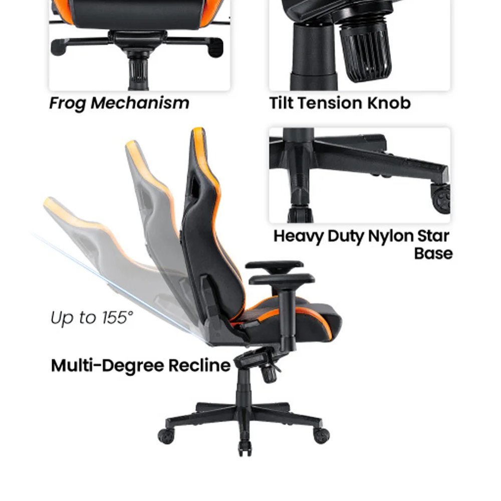 Introducing our premium gaming chair, the SH CH06 34, designed for the ultimate gaming experience. Crafted for both comfort and style, this chair stands out with its sleek black and orange PVC leather upholstery, giving your gaming setup a bold and energetic vibe. Built on a sturdy steel frame, this chair offers exceptional durability and can support up to 180kg (396lbs) of weight, ensuring it's suitable for gamers of all sizes.Designed with ergonomic considerations, the SH CH06 34 features a 155° tilt range of the back, allowing you to find the perfect angle for gaming, working, or relaxing. The 4D armrests provide flexibility and support, catering to your unique needs during long gaming sessions. The chair's 80mm Class 4 Gas Lift ensures smooth height adjustments, and the frog mechanism guarantees a seamless reclining experience.