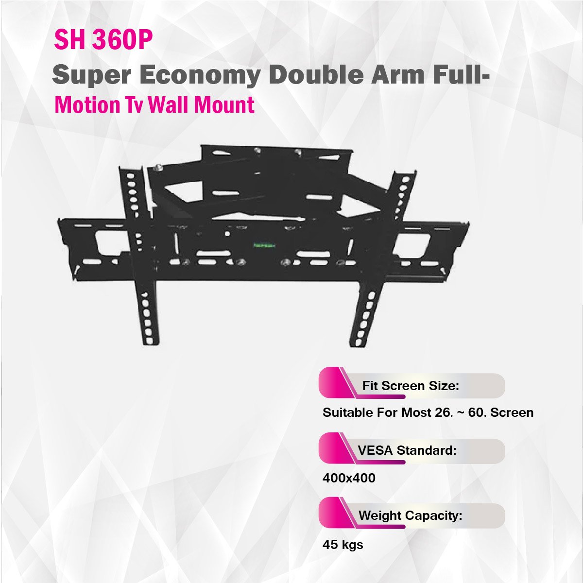 The SH 360P is an affordable and versatile double-arm Full-Motion TV Wall Mount designed for swiveling TVs. With a sleek black powder-coated finish, it complements your room's aesthetics while providing functionality. This wall mount is suitable for most 26" to 60" screens and features universal and economical mounting patterns. It's built to last, with a sturdy steel and plastic construction and a rated weight capacity of 45 kgs (99 lbs).The mount offers a VESA standard of 400x400, ensuring compatibility with various TV models. You can adjust your TV's positioning with ease, thanks to its tilt range of +15° to -15° and swivel range of +45° to -45°, allowing you to find the perfect viewing angle. The profile ranges from 70mm to 350mm, giving you flexibility in how close or extended you want your TV to be from the wall. It also includes cable management to keep your wires organized and your setup clean. This Full-Motion TV Wall Mount is ideal for solid wall or double stud installations, making it a practical choice for enhancing your TV watching experience.