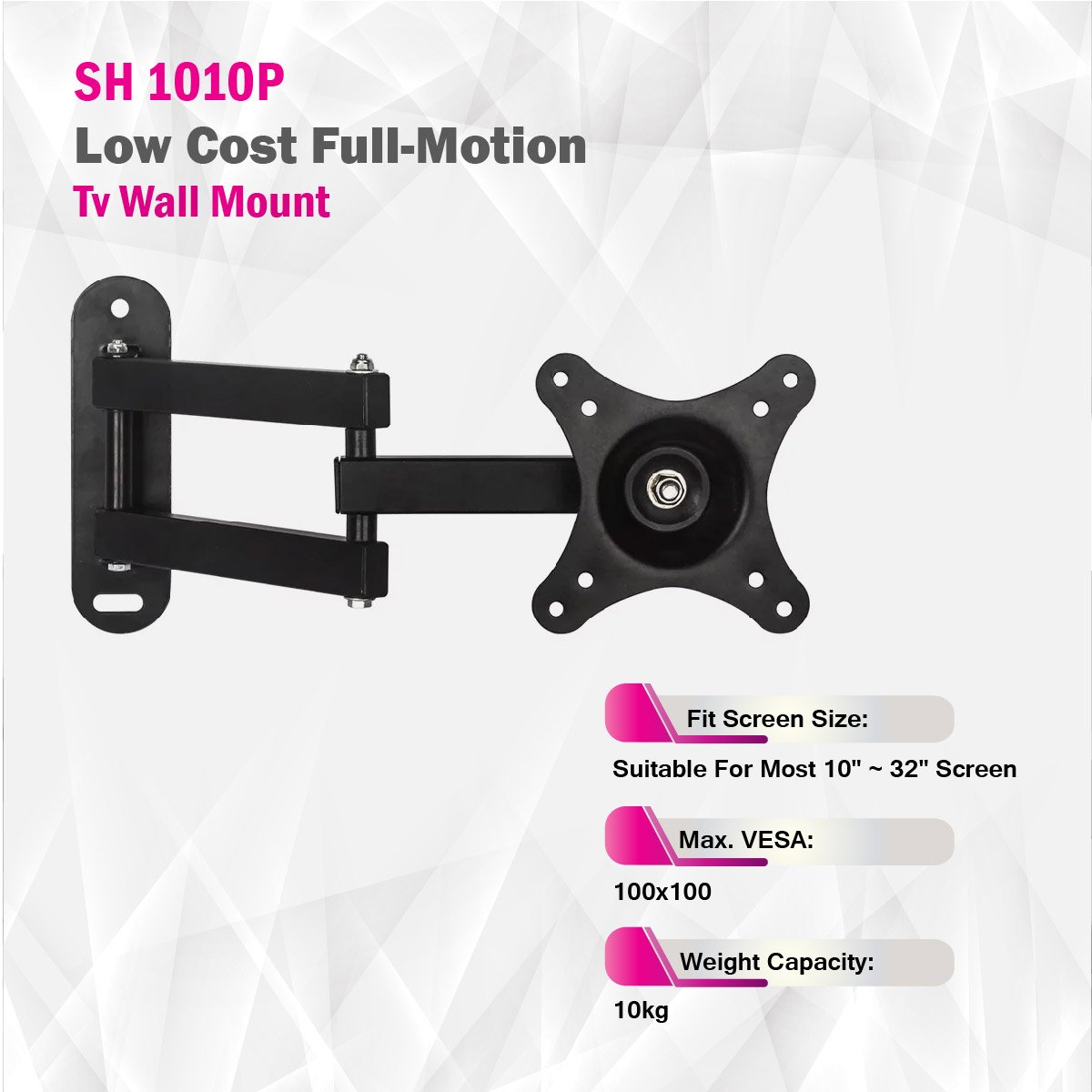 The SH 1010P Low Cost Full-Motion TV Wall Mount by Skill Tech is a practical and budget-friendly solution to enhance your home entertainment setup. Designed to accommodate screen sizes ranging from 10 to 32 inches, including curved TVs, this wall mount provides versatility for various television models. It features a VESA-only mounting hole pattern with compatibility for 75x75mm and 100x100mm VESA standards, ensuring it can securely hold your TV in place. With a weight capacity of 10kg, it's suitable for smaller screens. The wall mount has a fixed profile of 405mm, and while it doesn't offer tilt adjustment, it compensates with a swivel range of +45° to -45°, allowing you to achieve the ideal viewing angle. Installation is straightforward and designed for solid wall mounting. Additionally, it includes cable management options to keep your setup organized. The SH 1010P offers a cost-effective solution for optimizing your smaller screen TV viewing experience.