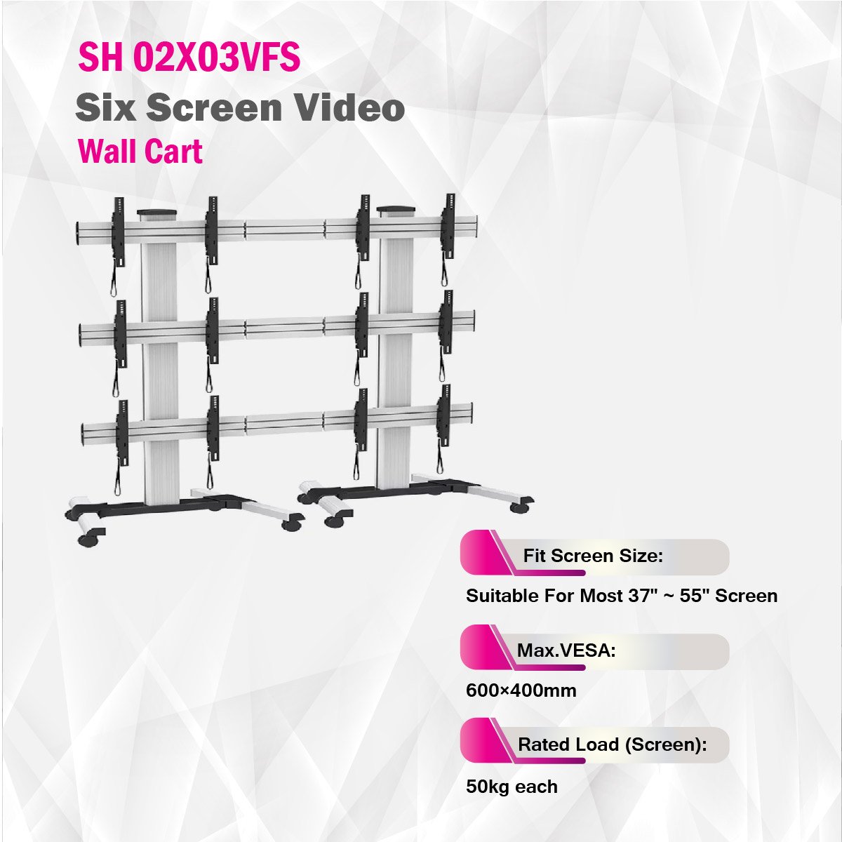 The SH 02X03VFS is a standard six-screen video wall cart designed to provide a flexible and mobile solution for multi-screen displays. Crafted from a combination of steel, aluminum, and plastic, this cart ensures durability and stability. It features a powder-coated and oxidized surface finish, adding both style and resilience to the design.With a total height of 1630mm (64.2 inches) and dimensions measuring 835x700x1630mm (32.9 inches x 27.6 inches x 64.2 inches), this cart is suitable for accommodating most 37" to 55" screens. It supports various VESA patterns, including 200x200, 400x200, 300x300, 400x400, and 600x400mm, offering compatibility with a wide range of screens.The SH 02X03VFS is capable of supporting up to six screens, arranged in a 2x3 configuration. Each screen has a maximum load capacity of 50kg, ensuring secure placement and stability. The cart provides a tilt range of +15° to -15° and screen rotation from +3° to -3°, allowing you to achieve optimal viewing angles for your displays.